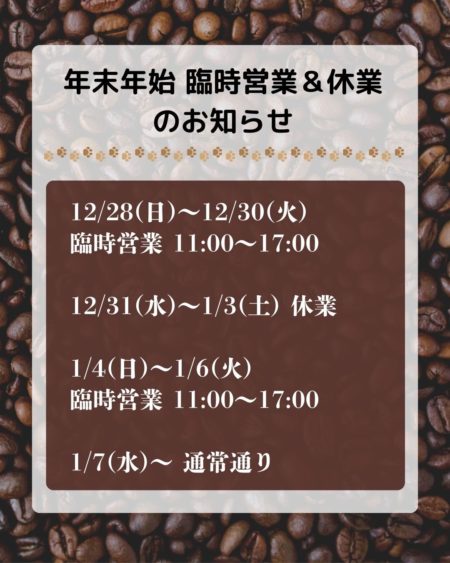 2026/01/16 13:15 ケニア タトゥAB 🇰🇪 ... 【新入荷】ケニア AB タトゥ農園(深煎り) 苦味 ★★★★酸味 ★★★☆コク ★★★☆香り ★★★☆ 重厚さと、ベリーのようなまろやかなフ […] 2026/01/21 12:04 ブレーメンウォーター デカ... 「デカフェは美味しくない」そんなイメージを、やさしく覆してくれるコーヒーです🌿 このコーヒーは、ドイツ・ブレーメンで開発された「ブレーメンウ […] 2026/01/10 21:00 ジョウビタキ&明日はつくい... 今日は通常営業でした😊 写真は、うちのこんざぶろう(※狐🦊) に止まったジョウビタキ(たぶん) 明日は1月のつくいちです。 9:00〜14: […] 2026/01/08 17:24 パッケージラベルをリニュー... 年明けを機に、 シングルコーヒーのパッケージラベルを リニューアルしました。 スペシャルティの 特別感が伝わるよう、説明文もプラスして。 贈 […] 2026/01/04 13:55 2026年1月 今月のブレ... あけましておめでとうございます🎍今年もよろしくお願い致します🥰 新年は今日から営業致します☕️1/4〜1/6は曜日ならびでは定休日になります […] 2025/12/27 21:10 年末年始の営業について 12月から定休が増えましたが、年末年始は、日月火も特別に営業致します🈺普段来られない方も、ぜひぜひ遊びにいらしてくださいね✨✨ 帰省お土産向 […] 12345...10...»LAST »